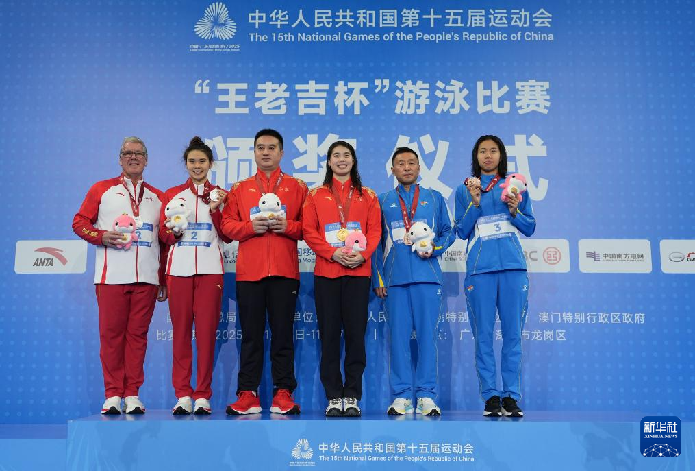 11月11日,冠军江苏队选手张雨霏(右三)与教练、亚军山东队选手王一淳(左二)与教练、季军辽宁队选手王靖卓(右一)与教练在颁奖仪式上合影。