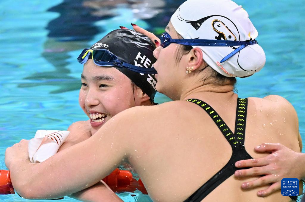 11月11日,河北队选手于子迪(后)在比赛后与浙江队选手余依婷拥抱致意,最终,于子迪打破亚洲纪录获得冠军,余依婷获得亚军。