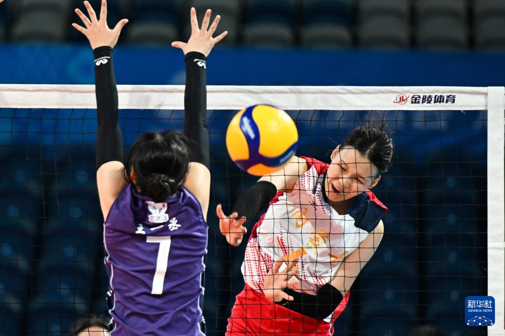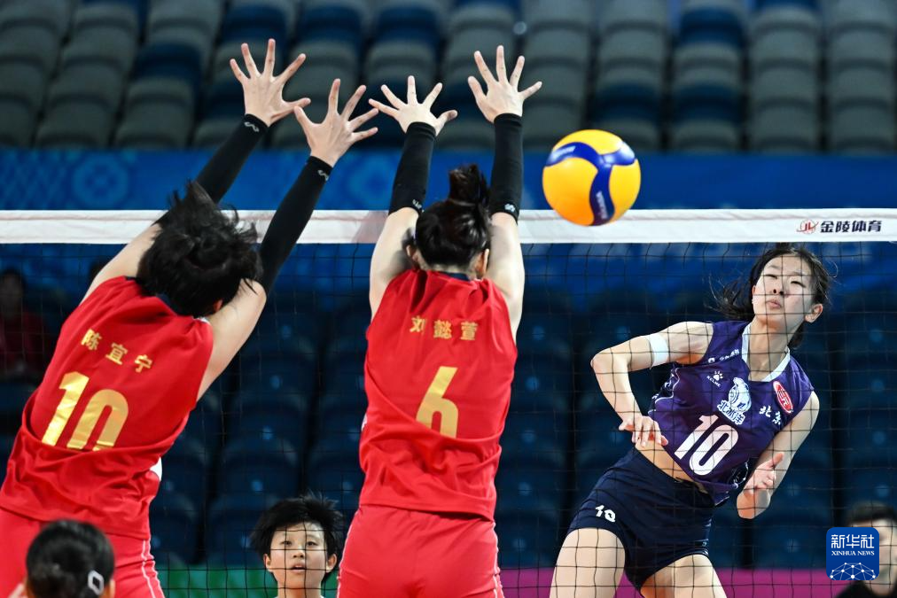 11月11日,北京队球员赵容慧(右)在比赛中扣球。
