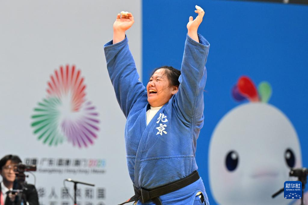 11月12日,北京队选手刘宇在女子78公斤以上级金牌赛中获胜后庆祝。她战胜河南队选手贾冰倩夺得冠军。