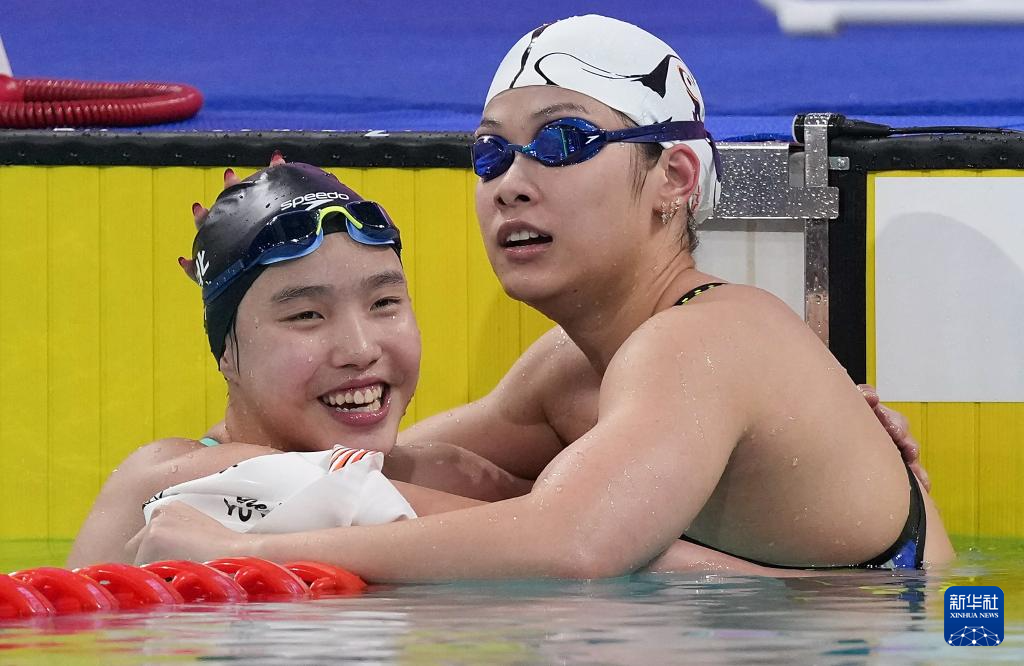 11月11日,河北队选手于子迪(左)在比赛后与浙江队选手余依婷拥抱致意。最终,于子迪打破亚洲纪录获得冠军,余依婷获得亚军。