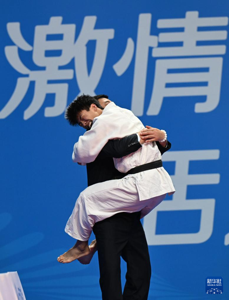 11月11日,江苏队选手王江南(右)在男子81公斤级金牌赛中获胜后与教练拥抱庆祝。他战胜福建队选手赛音吉日嘎拉夺得金牌。