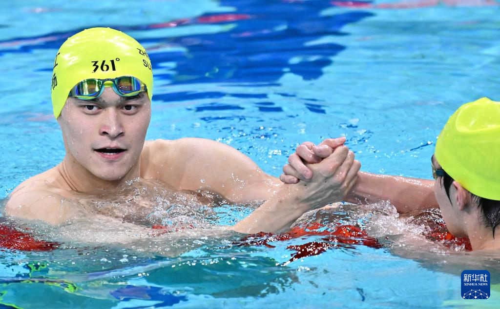 11月11日,浙江队选手孙杨(左)在比赛后与湖北队选手徐海博握手致意。最终,他们晋级决赛。
