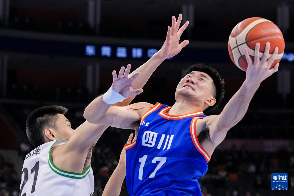 11月12日,四川队球员胡金秋(左)在比赛中上篮。