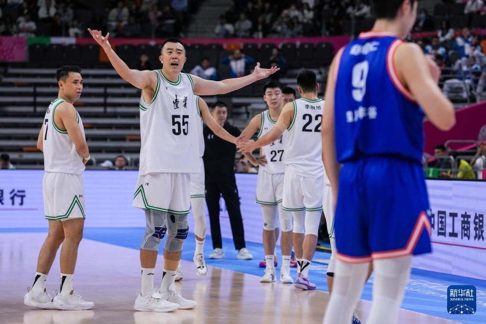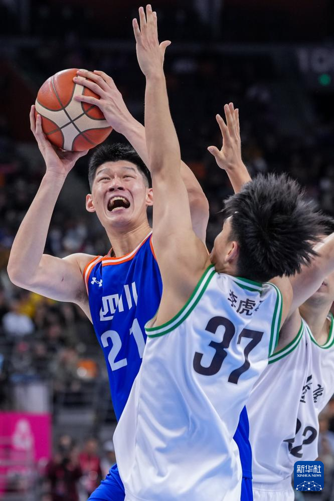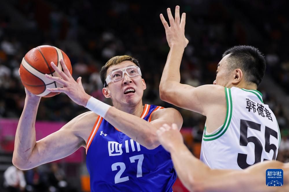 11月12日,四川队球员周琦(左)在比赛中进攻。