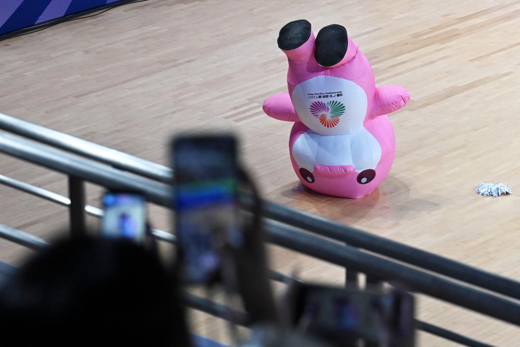 11月11日,第十五届全国运动会吉祥物“喜洋洋”“乐融融”在比赛间隙表演。新华社记者 黄伟 摄