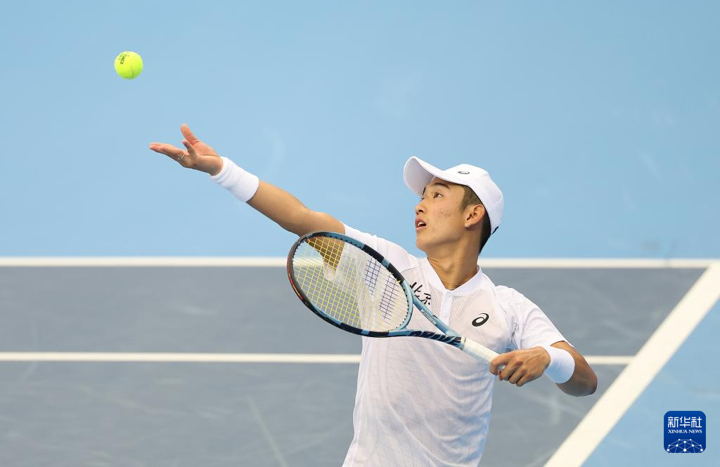 11月12日,北京队选手商竣程在比赛中发球。他在单打比赛中2比0战胜唐锦鹏。