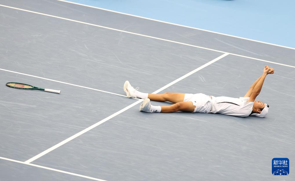 11月12日,江苏队选手胡佳获胜后倒地庆祝。他在单打比赛中2比0战胜北京队选手齐洪瑾。