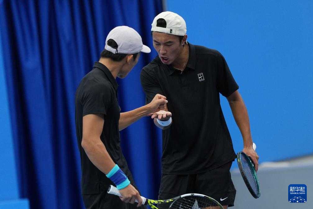 11月12日,北京队组合宋雨桥/张博雄(右)在比赛中庆祝得分。他们在双打比赛中对阵江苏队组合陈显峰/徐旷清。
