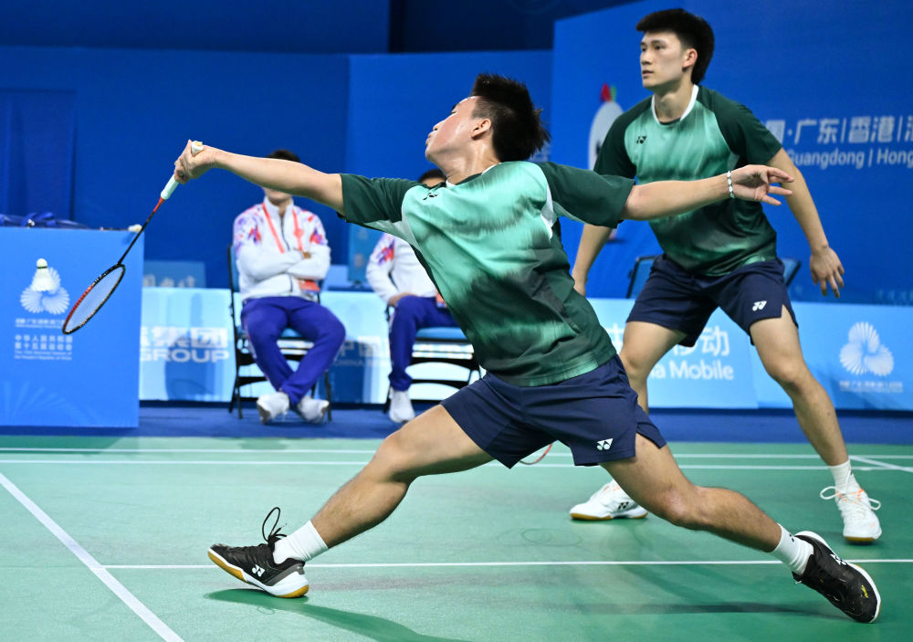 11月11日,香港队组合洪魁骏/吕俊玮(左)在男双比赛中回球。他们2:0战胜湖北队组合陈治国/杨嘉卓。当日,在深圳进行的第十五届全运会羽毛球男子团体E组比赛中,湖北队3:2战胜香港队。新华社记者 李紫恒 摄