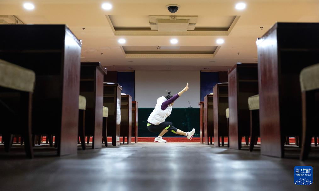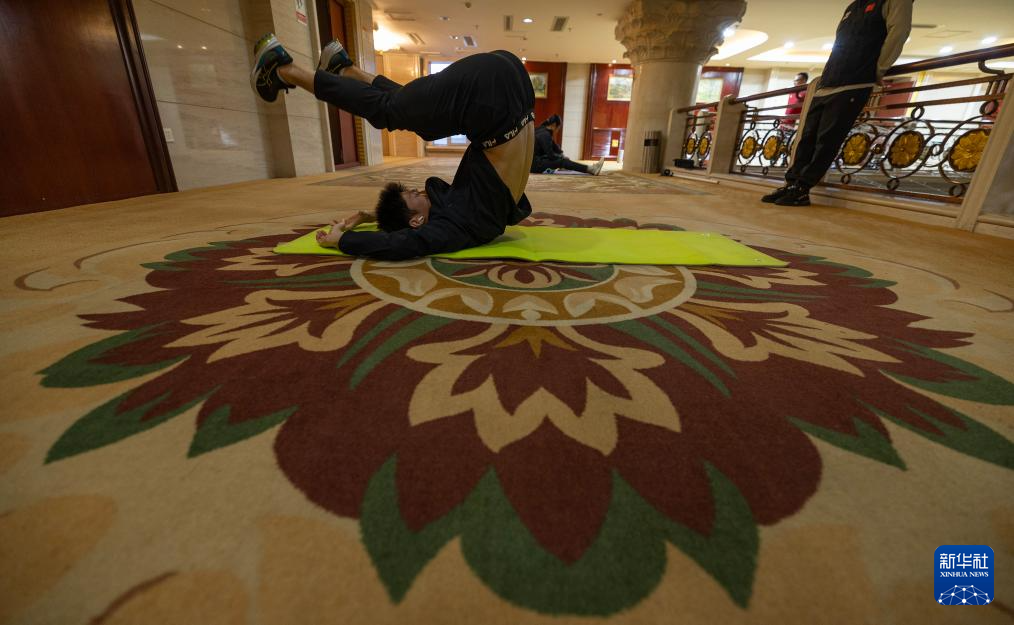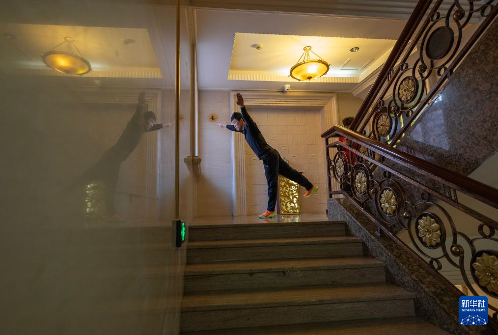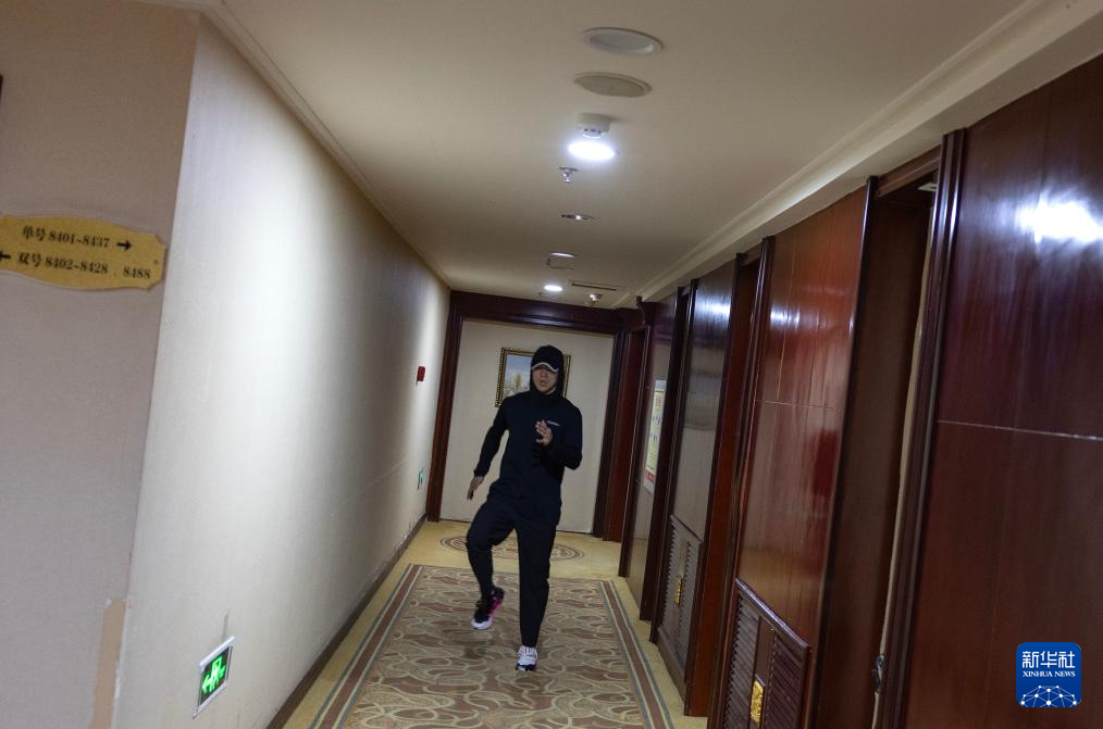 11月4日,在宾馆走廊上,自由式滑雪空中技巧国家集训队队员王心迪在进行热身。