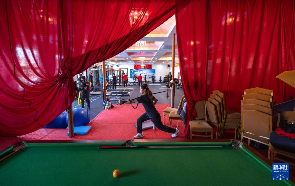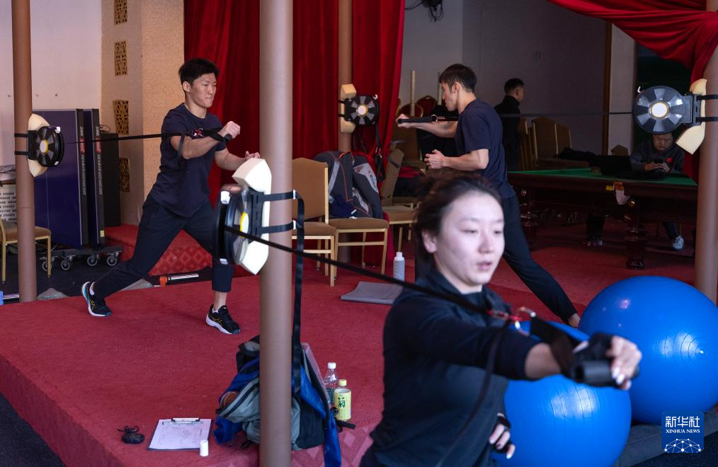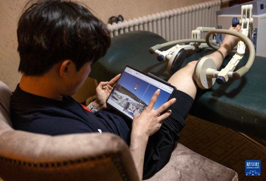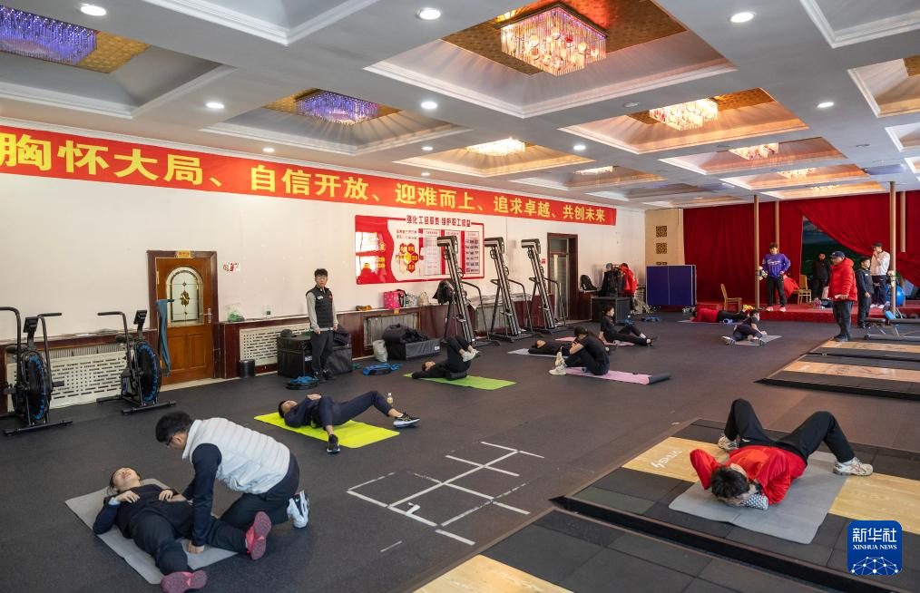 队员们的日常训练通常从清晨开始,天光初亮,他们已经在宾馆的走廊、会议室甚至电梯间门口开始拉伸和热身训练。简单的早饭后,他们会来到雪场顶着寒风反复起跳、旋转、落地,专注打磨每一个动作细节。三个小时的空中动作技术训练结束后,队员们在下午来到宾馆附近由食堂改造成的临时体能训练馆进行体能、力量训练。体能教练根据每个队员的身体状态科学安排训练强度和项目,确保他们在完成核心力量、爆发力及柔韧性等训练的同时保持良好状态。晚饭后,队员们相继走进由宾馆房间临时改造的恢复区,随队医生、康复师将为他们进行理疗、按摩,帮助他们恢复体能。