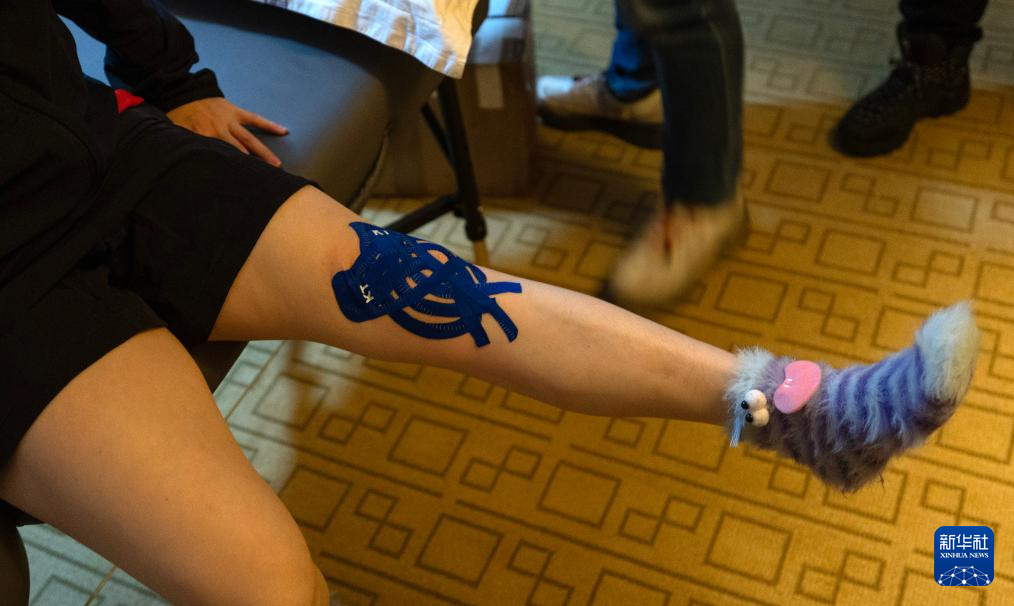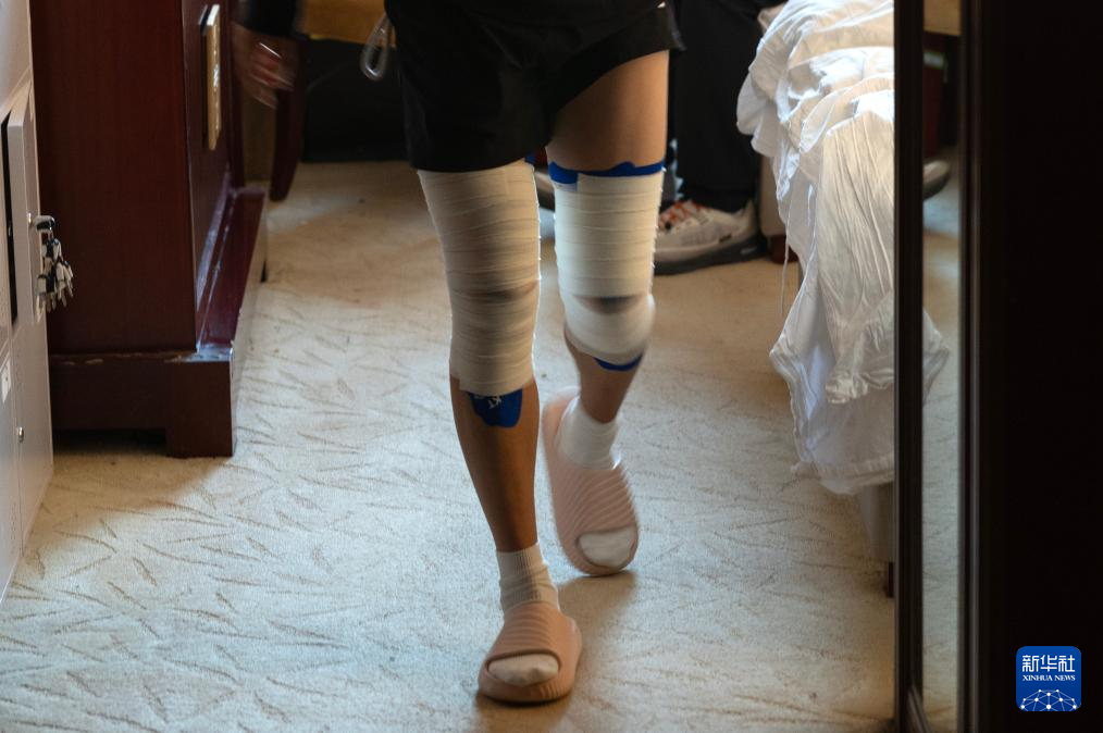 11月4日晚,在宾馆房间改造成的按摩室里,自由式滑雪空中技巧国家集训队队员孙凡钰在治疗结束后,查看自己膝盖上的防护胶布。