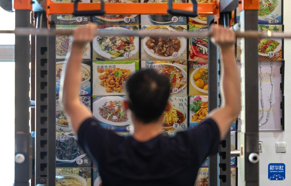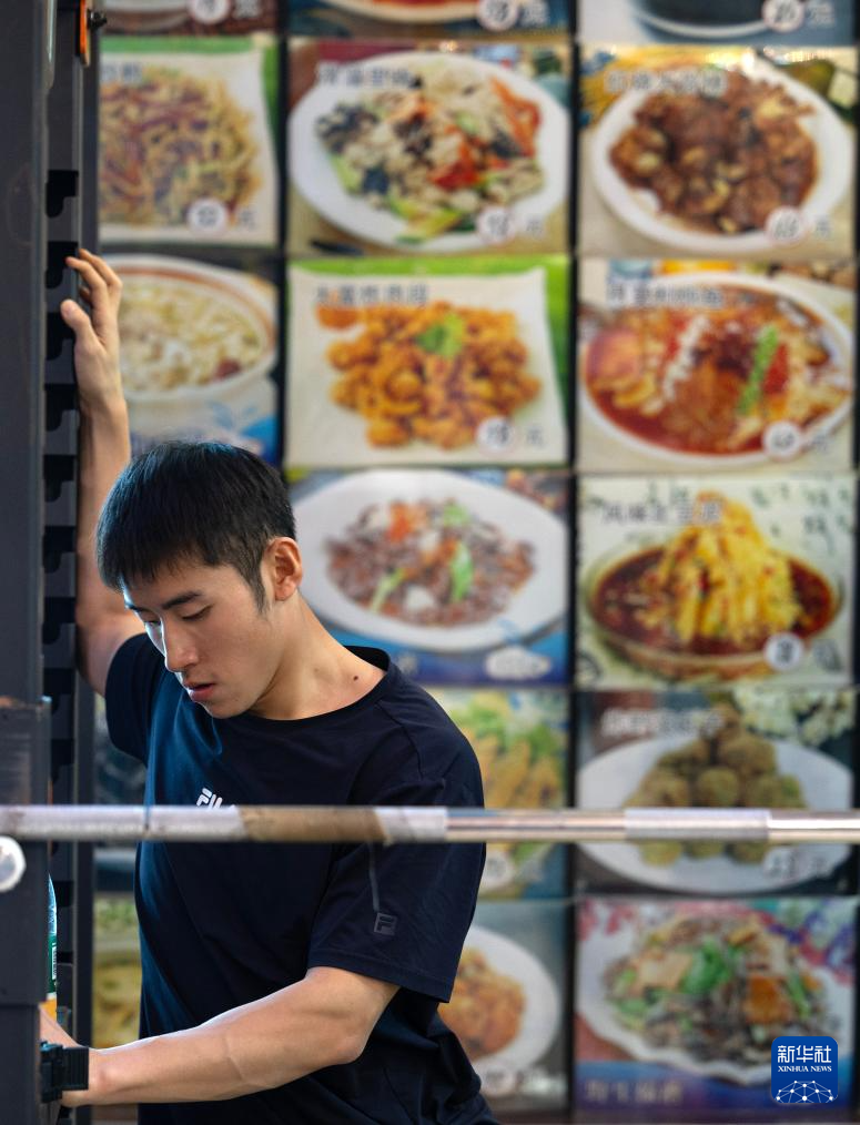 11月6日,在食堂改造而成的临时体能训练馆里,自由式滑雪空中技巧国家集训队队员李天马面对着墙上的菜谱进行体能和力量训练。