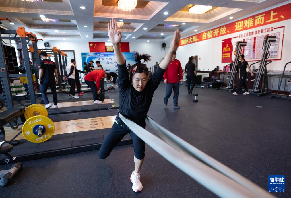 11月4日,在食堂改造而成的临时体能训练馆里,自由式滑雪空中技巧国家集训队队员徐梦桃在进行体能和力量训练。