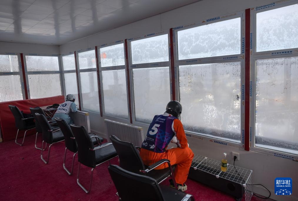 11月7日清晨,在雪场顶端的小屋里,自由式滑雪空中技巧国家集训队队员李天马(右)和邵琪在训练间隙取暖。