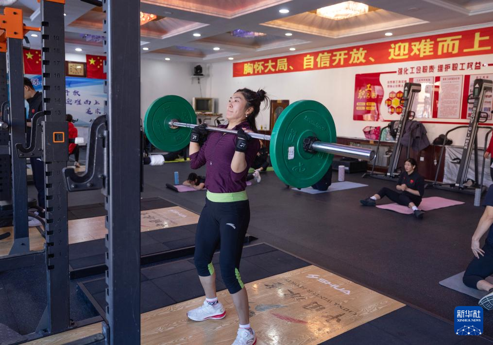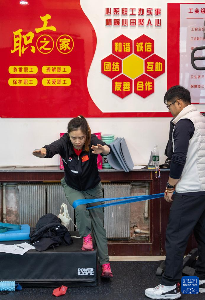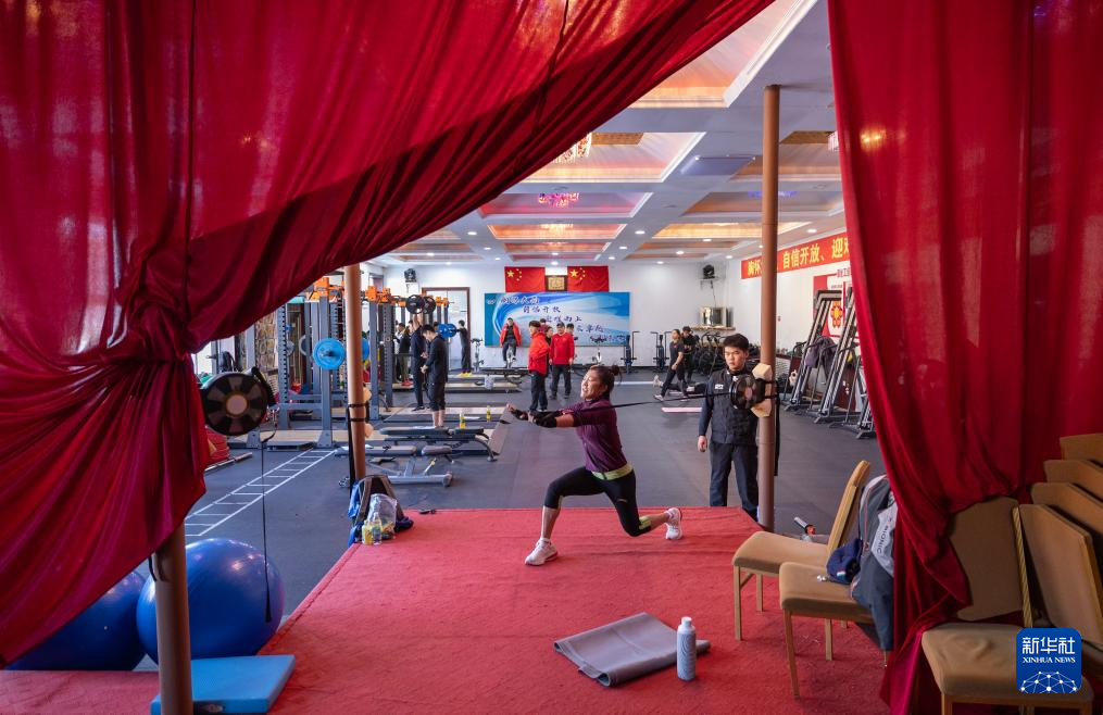 11月6日,在食堂改造而成的临时体能训练馆里,自由式滑雪空中技巧国家集训队队员陈梅婷在进行体能和力量训练。