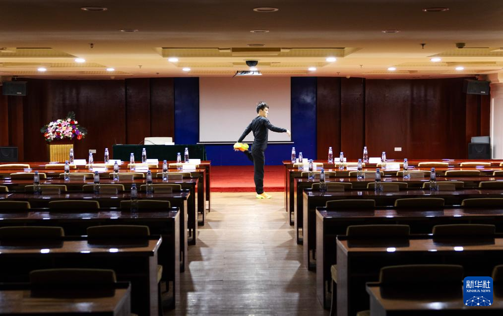11月7日清晨,在宾馆会议室,自由式滑雪空中技巧国家集训队队员齐广璞在进行拉伸。