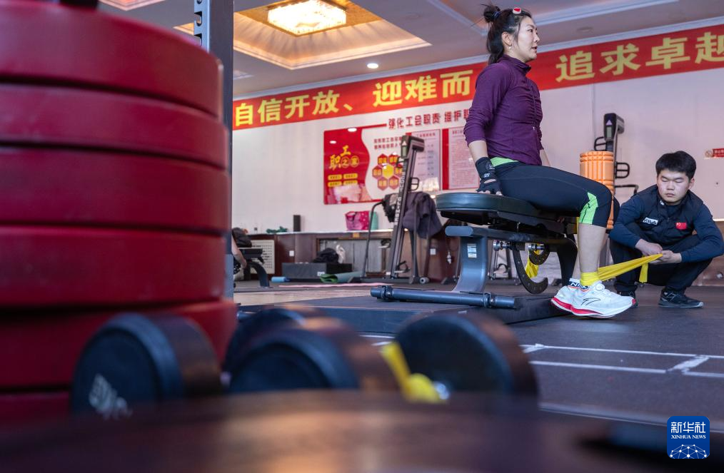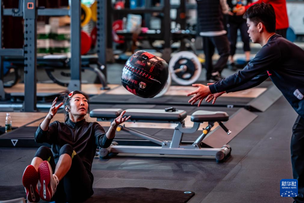 11月4日,在食堂改造而成的临时体能训练馆里,自由式滑雪空中技巧国家集训队队员徐梦桃(右)在体能教练任四伟的帮助下进行体能和力量训练。