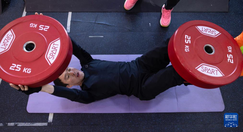11月4日,在食堂改造而成的临时体能训练馆里,自由式滑雪空中技巧国家集训队队员王心迪在进行体能和力量训练。