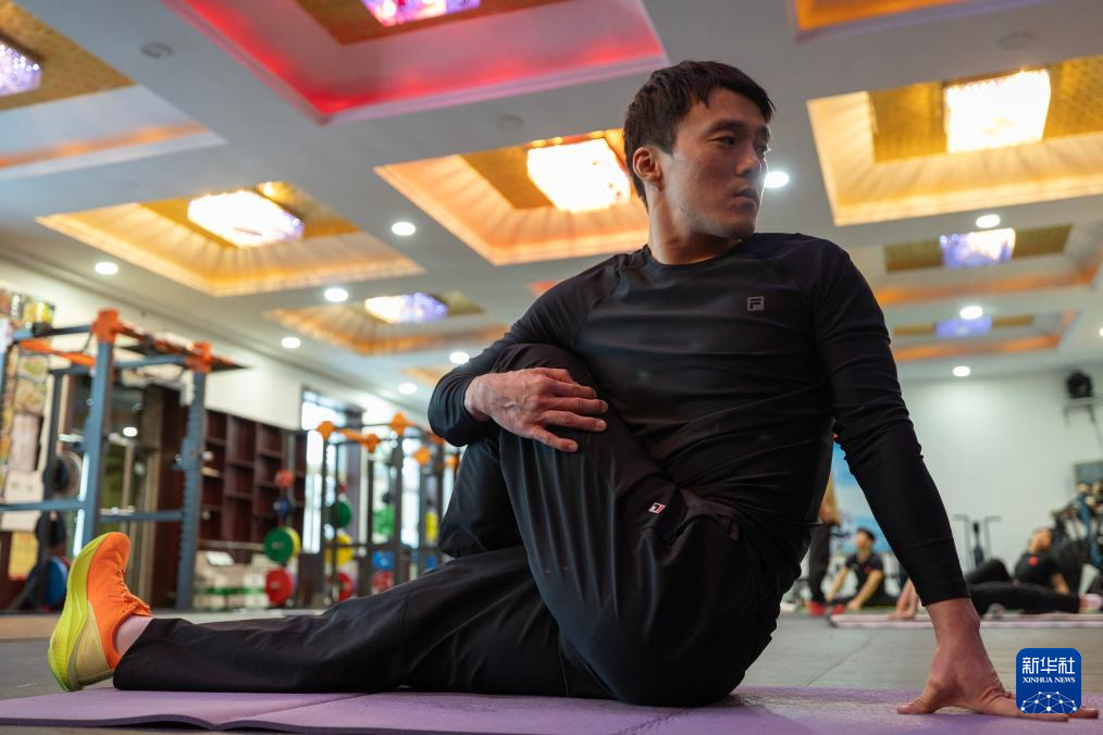 11月6日,在食堂改造而成的临时体能训练馆里,自由式滑雪空中技巧国家集训队队员齐广璞在体能和力量训练结束后拉伸。
