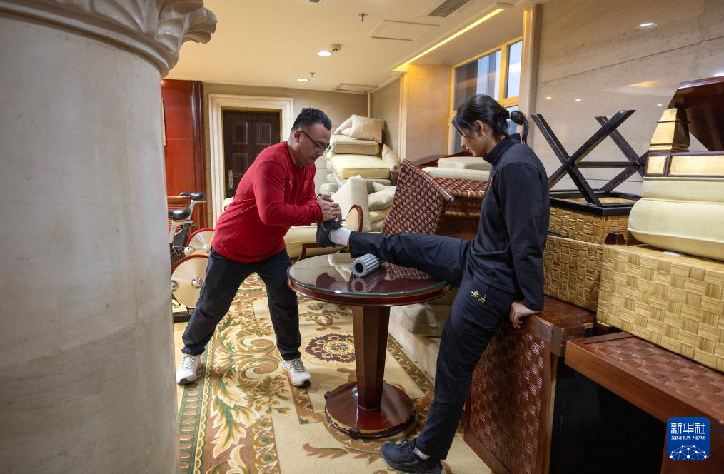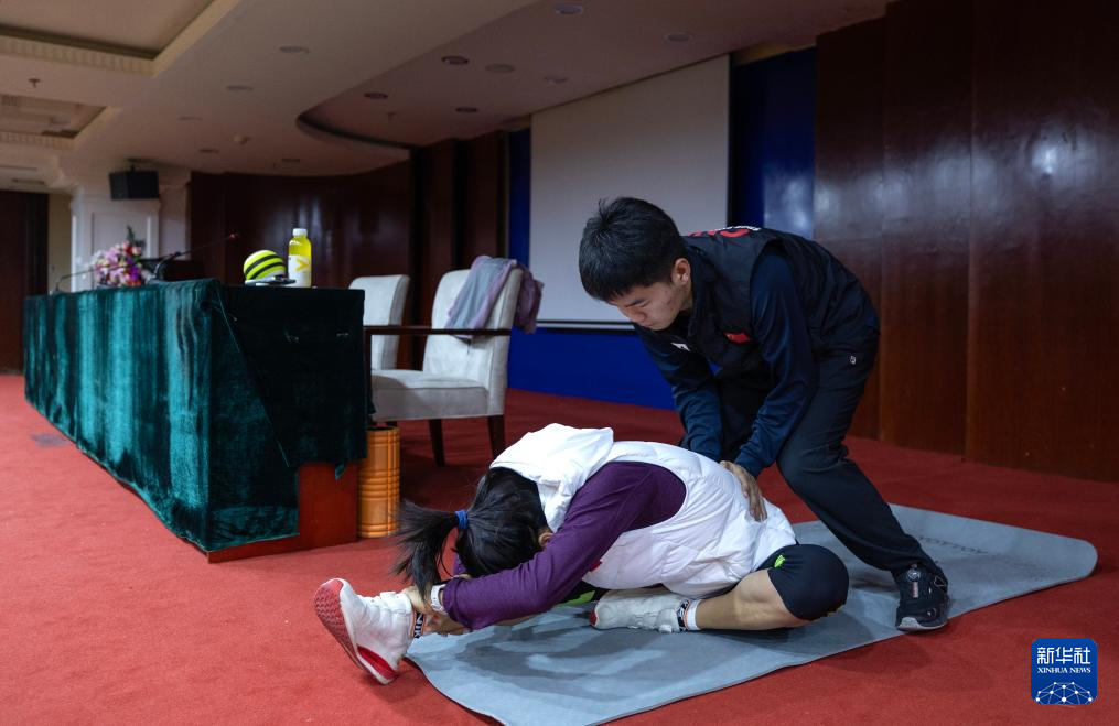 11月6日清晨,在宾馆会议室,自由式滑雪空中技巧国家集训队队员徐梦桃(左)在进行拉伸。