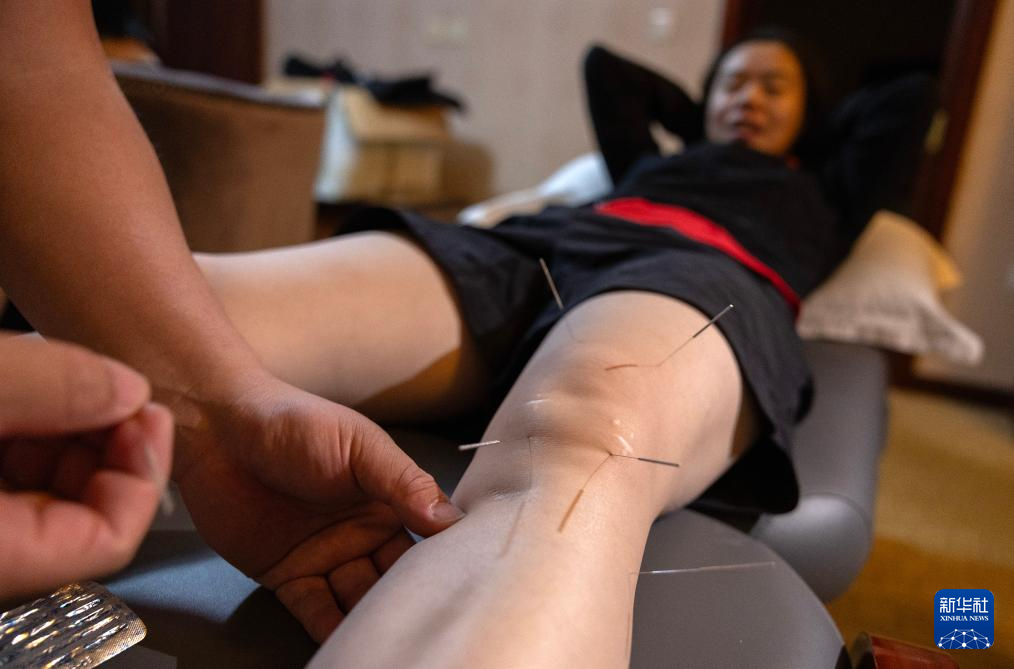 11月4日,在宾馆房间改造而成的临时按摩室里,自由式滑雪空中技巧国家集训队队医江继君在为队员孔凡钰进行针灸治疗。
