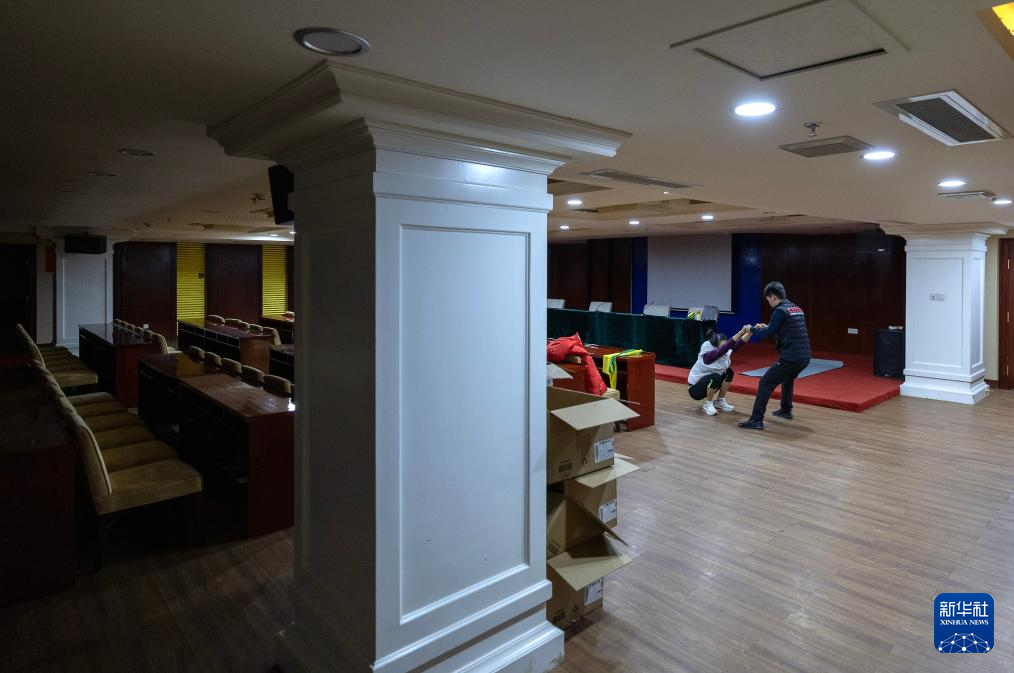 11月6日,在食堂改造而成的临时体能训练馆里,自由式滑雪空中技巧国家集训队队员齐广璞(右)和队友孙佳旭在进行体能和力量训练。