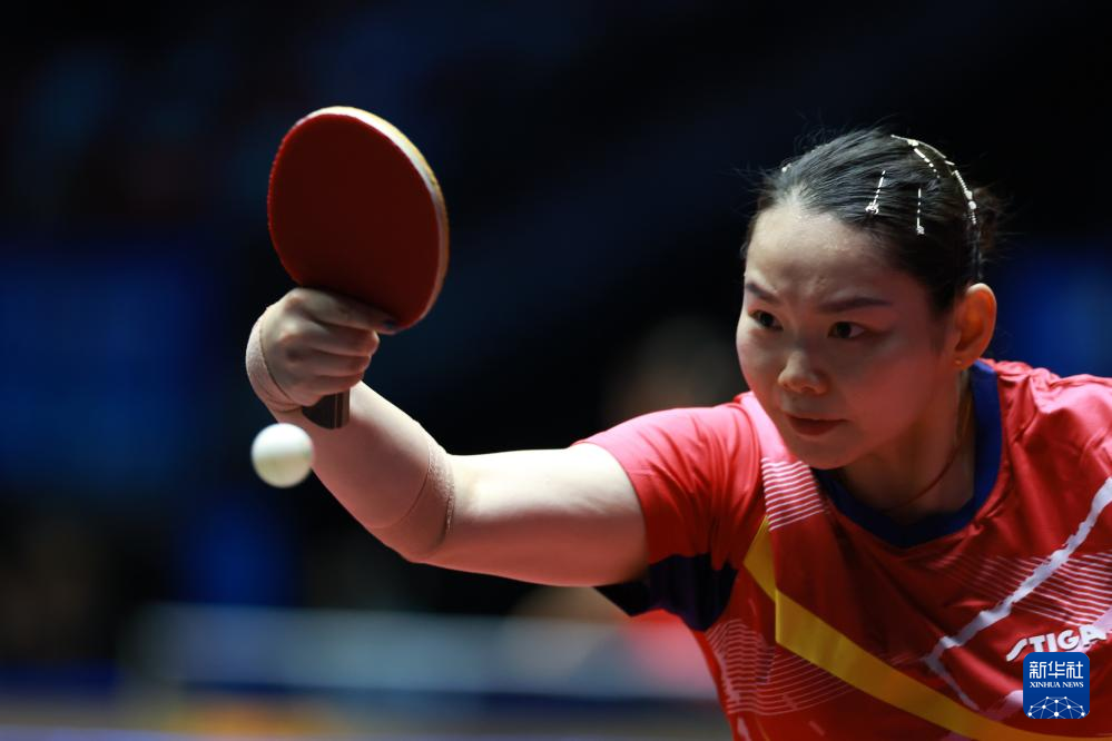 11月12日,何卓佳在比赛中回球。
