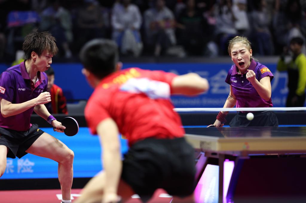 2025年11月13日,林高远/刘诗雯(前)在第十五届全国运动会乒乓球混合双打半决赛中。新华社记者 梁旭 摄