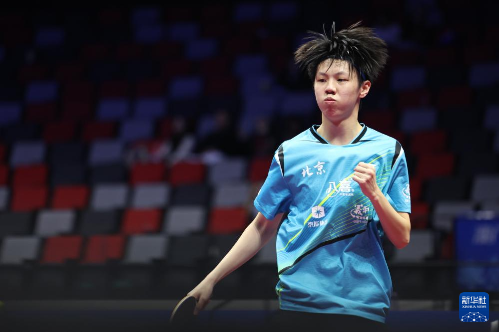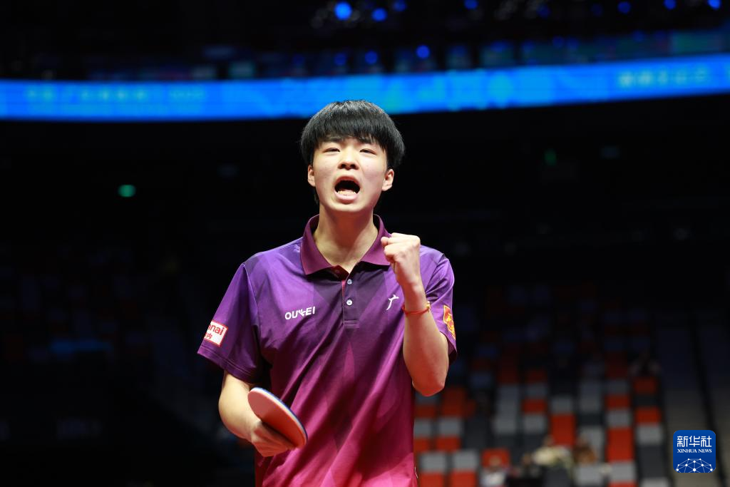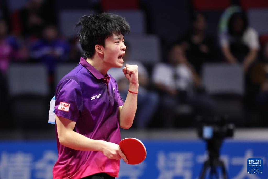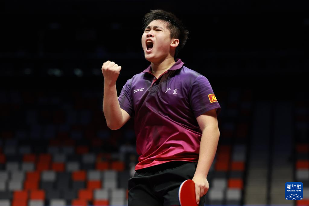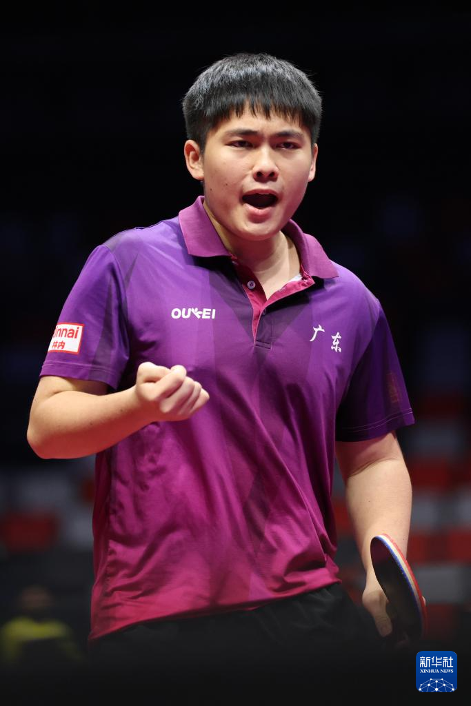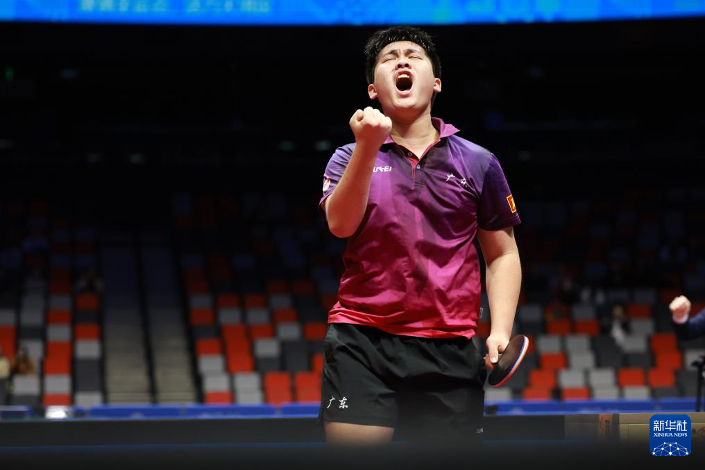 11月13日,广东队选手冯泽华在比赛中庆祝得分。他0比3不敌北京队选手黄友皓。