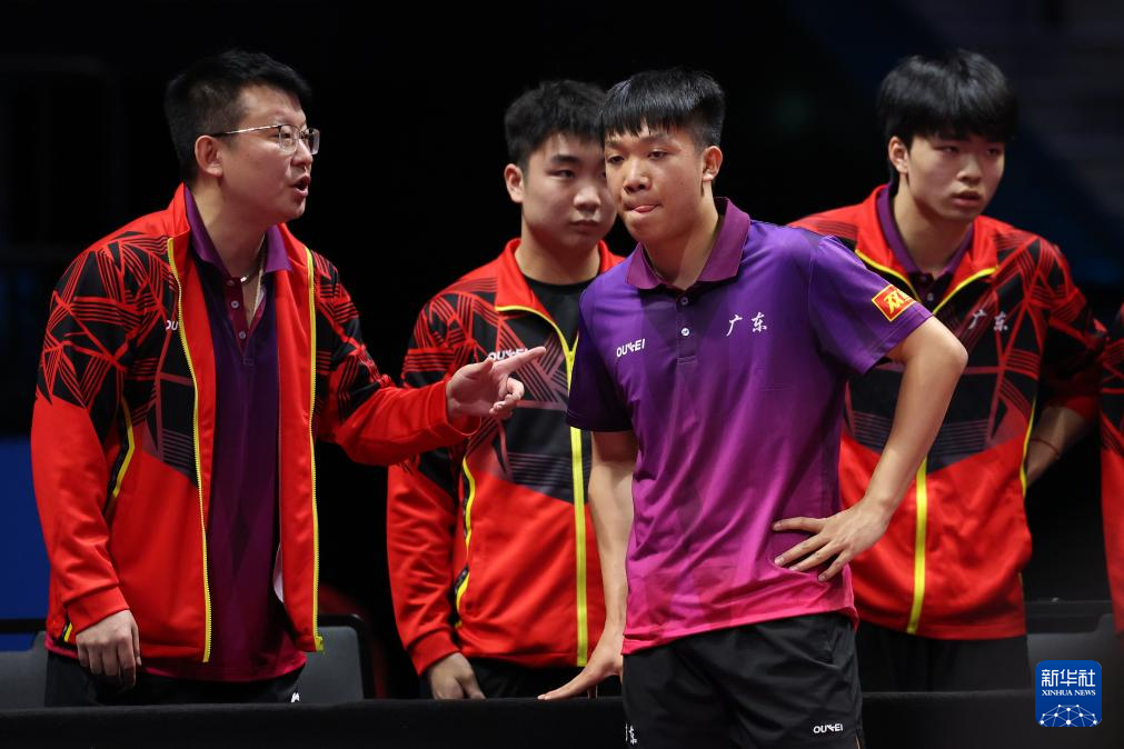 11月13日,广东队选手黄旭男在比赛间隙接受教练指导。他3比0战胜北京队选手孙杨。