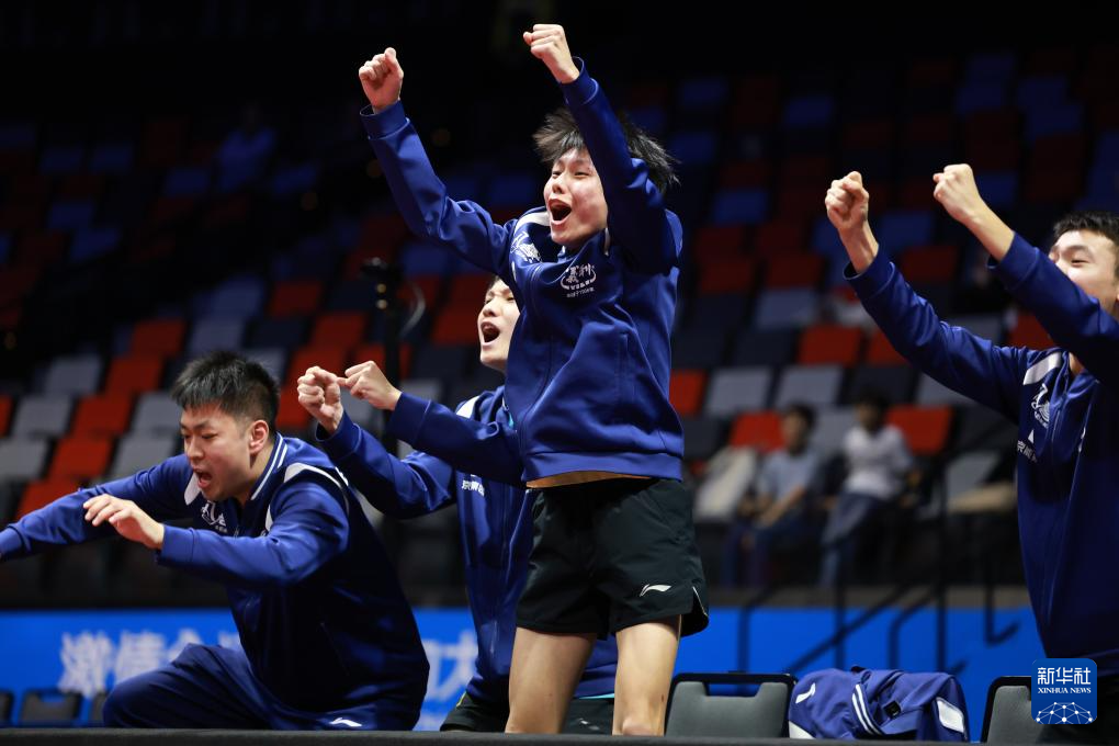 11月13日,广东队选手在场边庆祝队友龙宇得分。龙宇2比3不敌北京队选手孙杨。