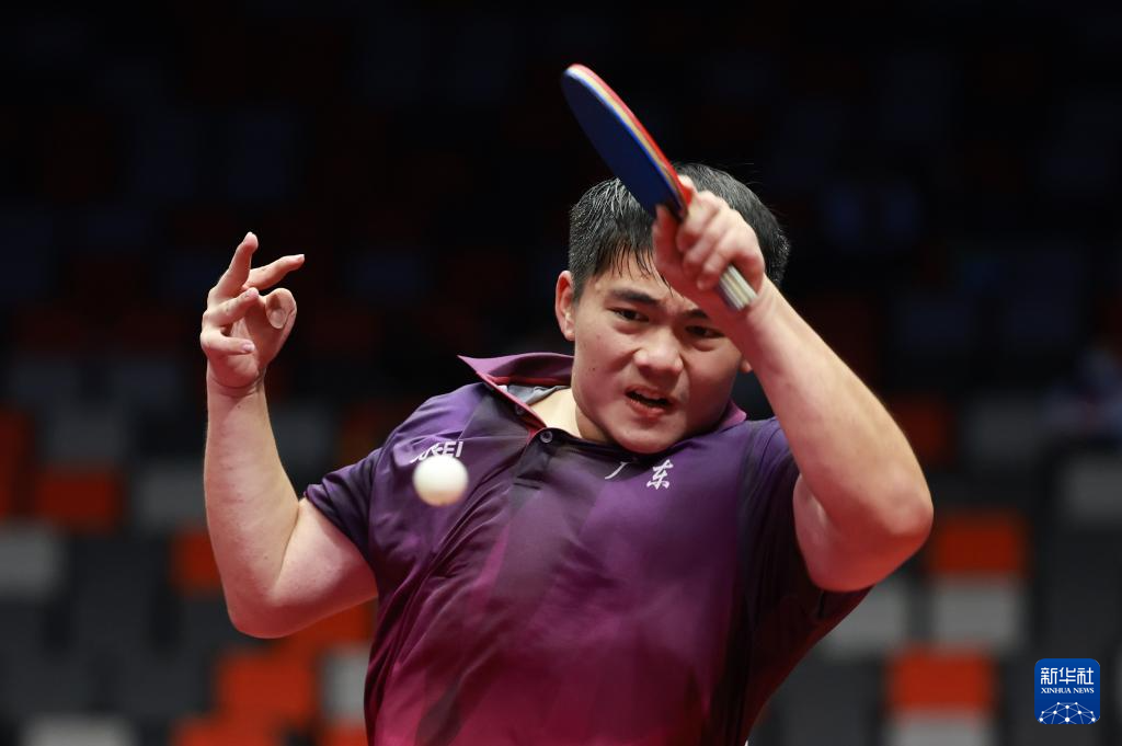11月13日,广东队选手龙宇在比赛中回球。他0比3不敌北京队选手陈恒达。
