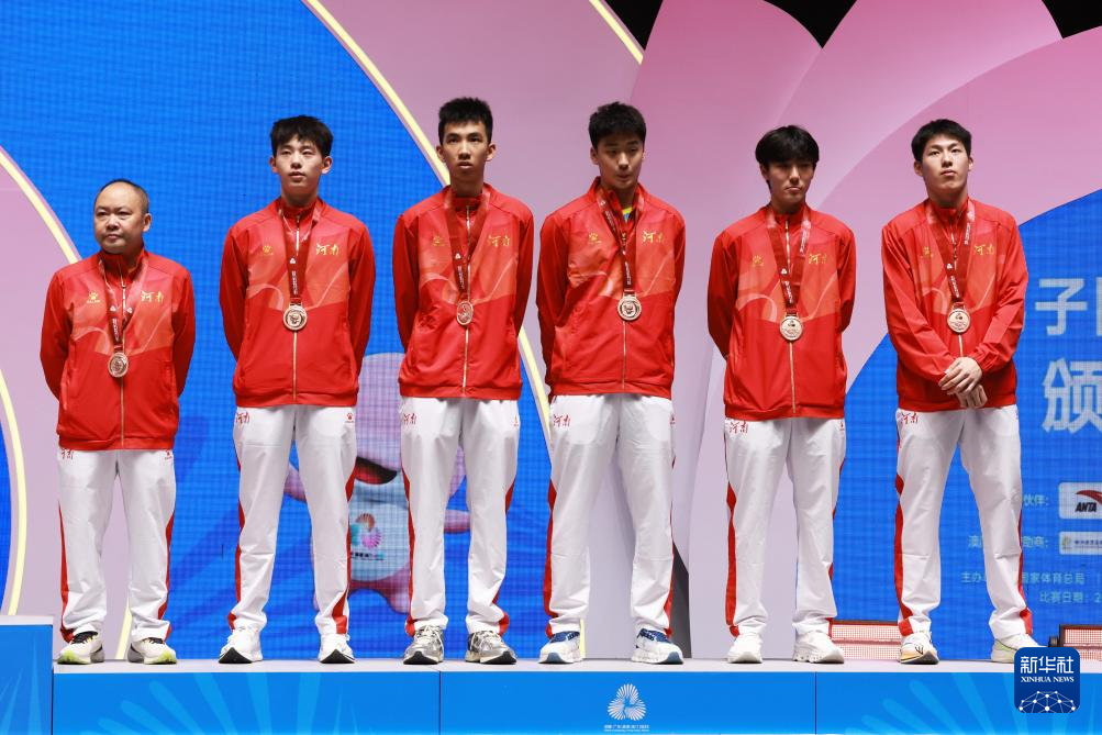 11月13日,获得冠军的北京队成员(中)、获得亚军的广东队成员(左)和获得季军的河南队成员在颁奖仪式上合影。