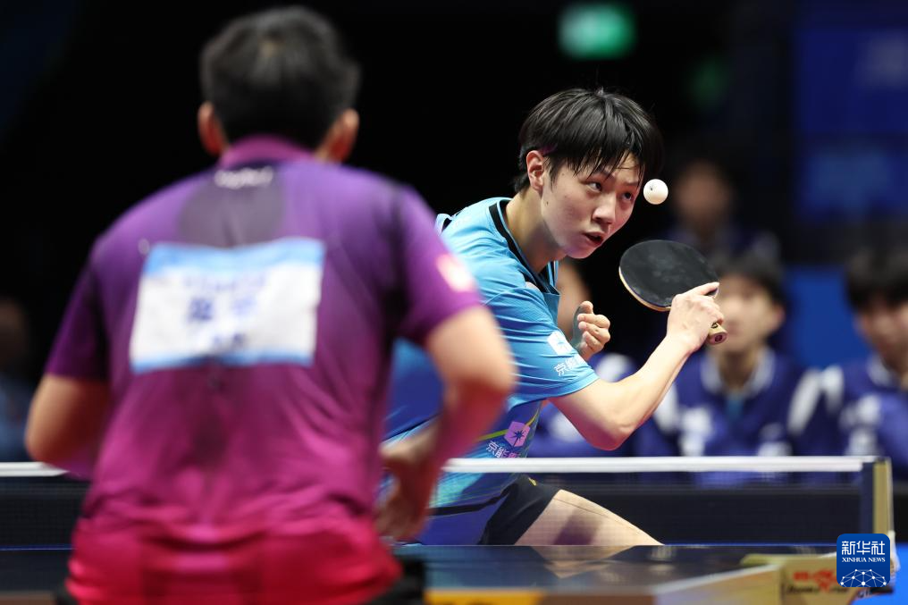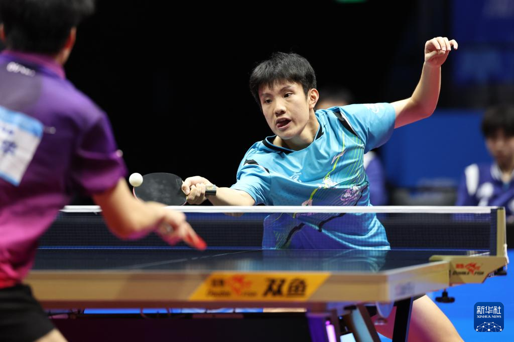 11月13日,广东队选手黄旭男在比赛中回球。他3比0战胜北京队选手孙杨。