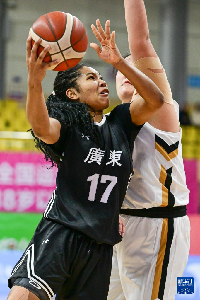 11月13日,广东队球员艾楚姬(左)在比赛中进攻。