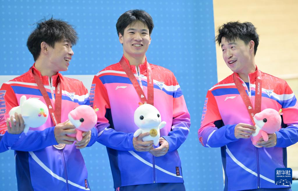11月13日,冠军河南队选手唐浩举(右七)、刘琦(右六)、冯钰生(右五),亚军浙江队选手詹泽伟(左五)、陆家辰(左四)、徐家壕(左二)、替补选手严炜明(左三),季军上海队选手王海洲(右一)、周瑜(右二)、金智恒(右三)在颁奖仪式上和教练合影。