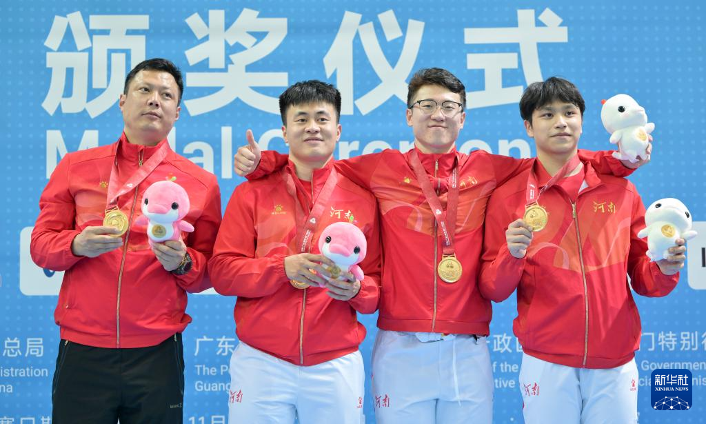 11月13日,冠军河南队选手唐浩举(左二)、刘琦(右二)、冯钰生(右一)和教练在颁奖仪式上合影。