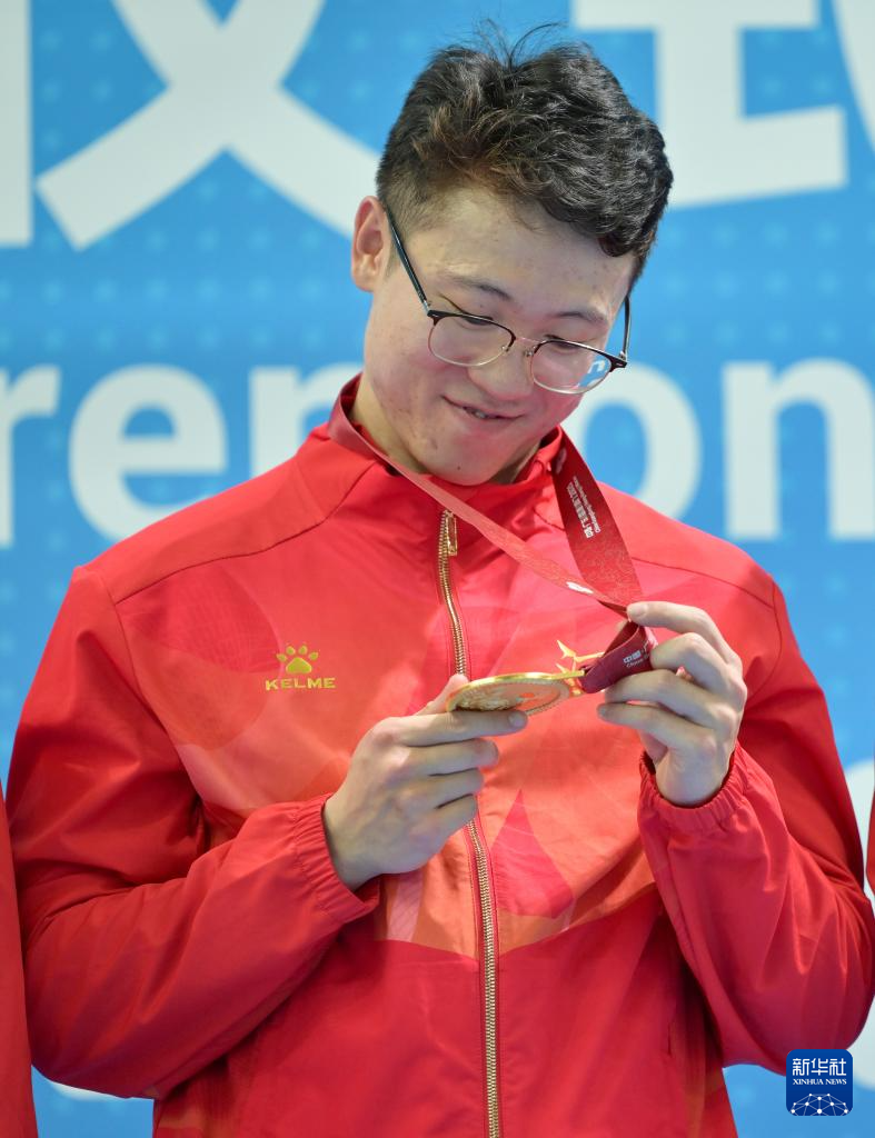11月13日,河南队选手刘琦在颁奖仪式上欣赏金牌。