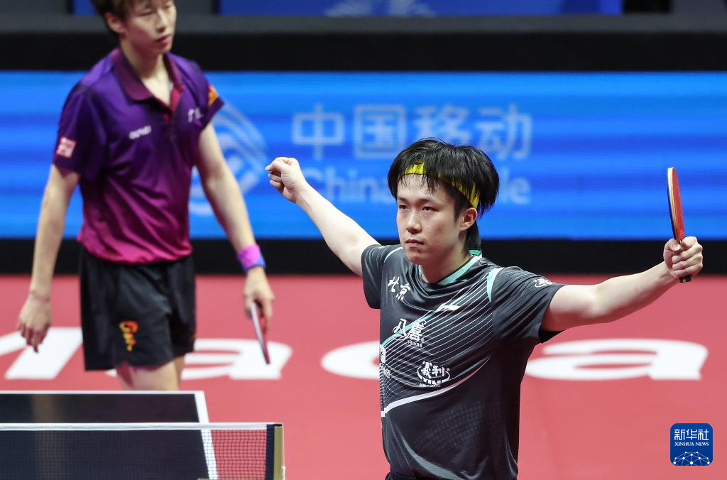 11月13日,北京队选手王楚钦(右)在比赛后庆祝胜利。