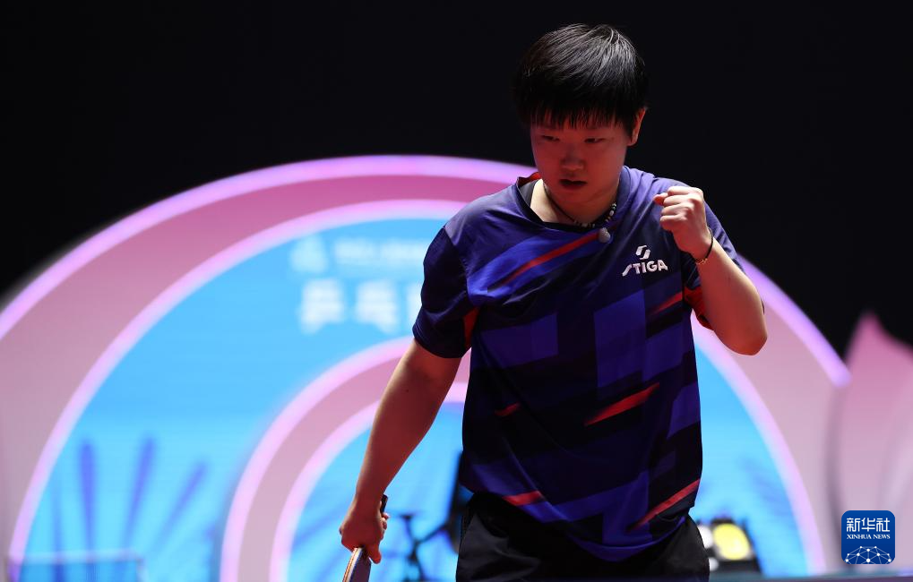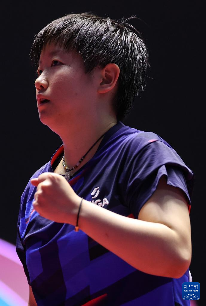 11月13日,河北队选手孙颖莎在比赛中庆祝。