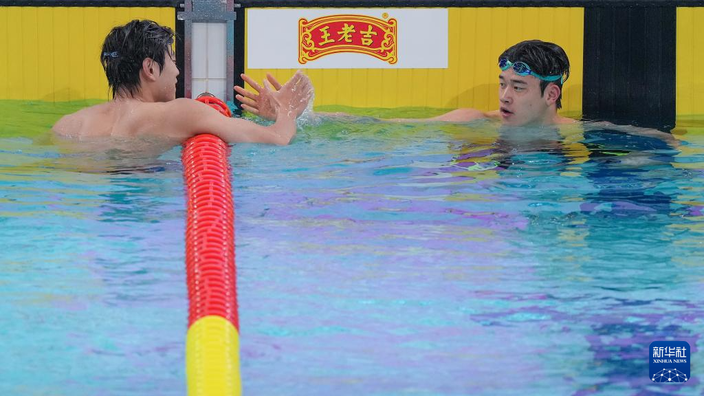 11月13日,浙江队选手潘展乐(右)与福建队选手刘吴狄在比赛后握手。他们均晋级决赛。