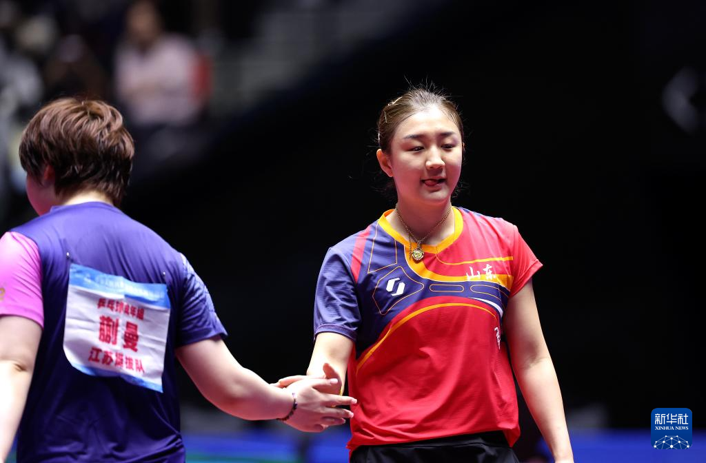 11月13日,山东队选手陈梦(右)在比赛后和江苏队选手蒯曼握手。