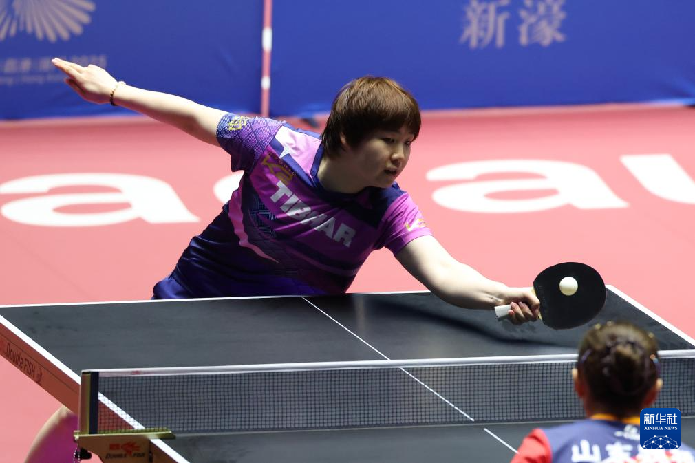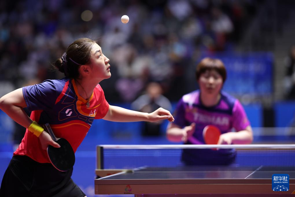 11月13日,山东队选手陈梦(左)在比赛中回球。