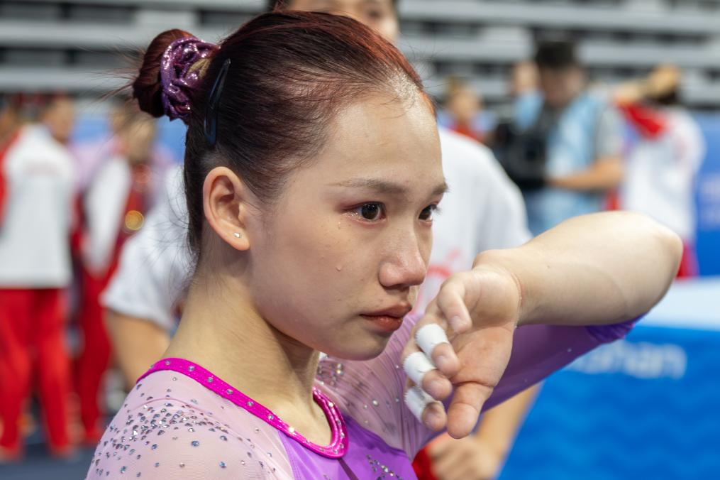 11月13日,广东队选手欧钰珊在比赛后落泪。新华社记者 杜子璇 摄