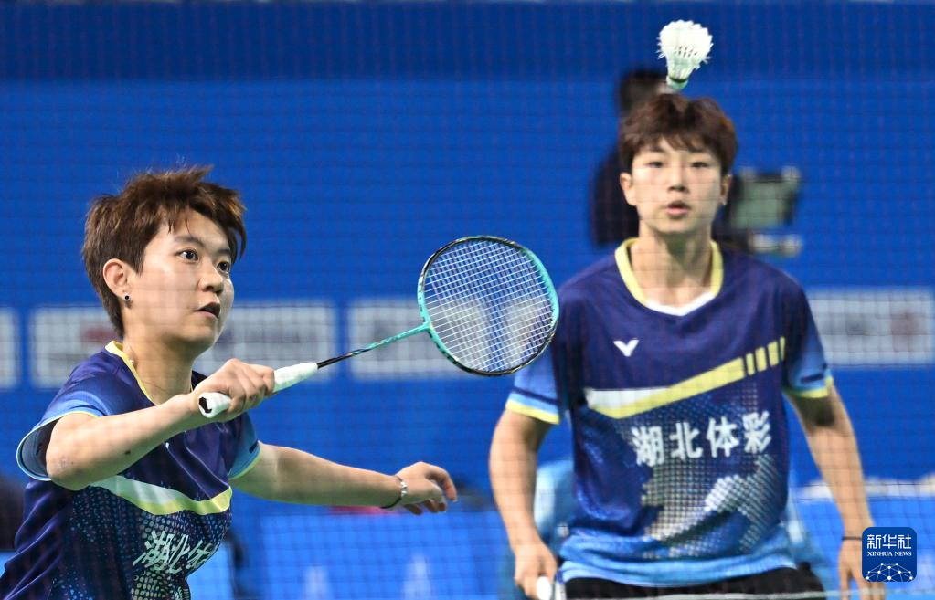 11月14日,湖北队组合杜玥(左)/华晓蓓在女双比赛中。她们0比2不敌广东队组合李怡婧/罗徐敏。