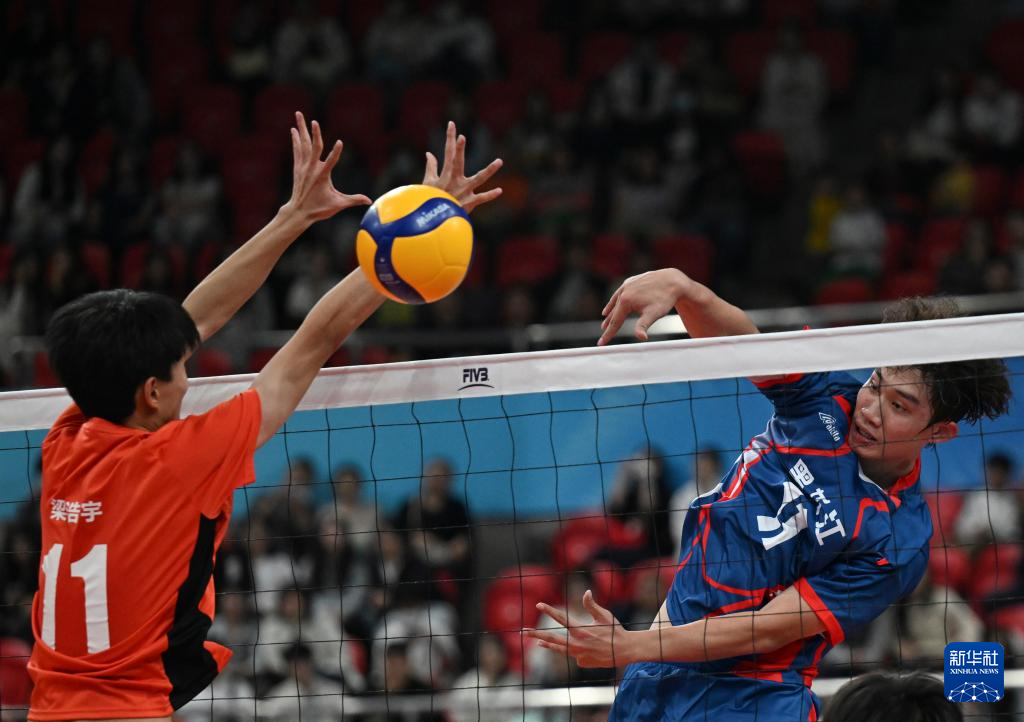 11月14日,黑龙江队球员曹琪浩(上)在比赛中扣球。