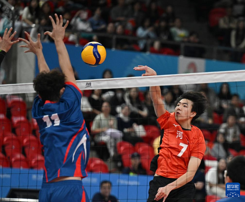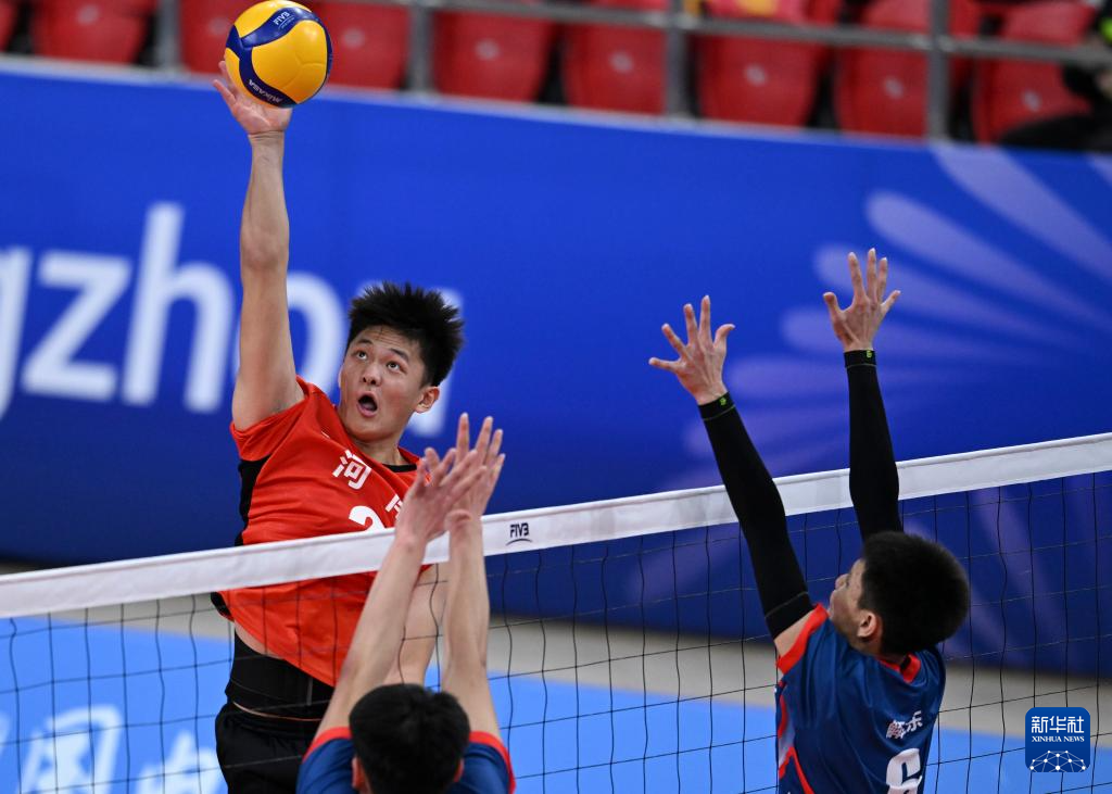 11月14日,河南队球员冀宇浩(左)在比赛中扣球。