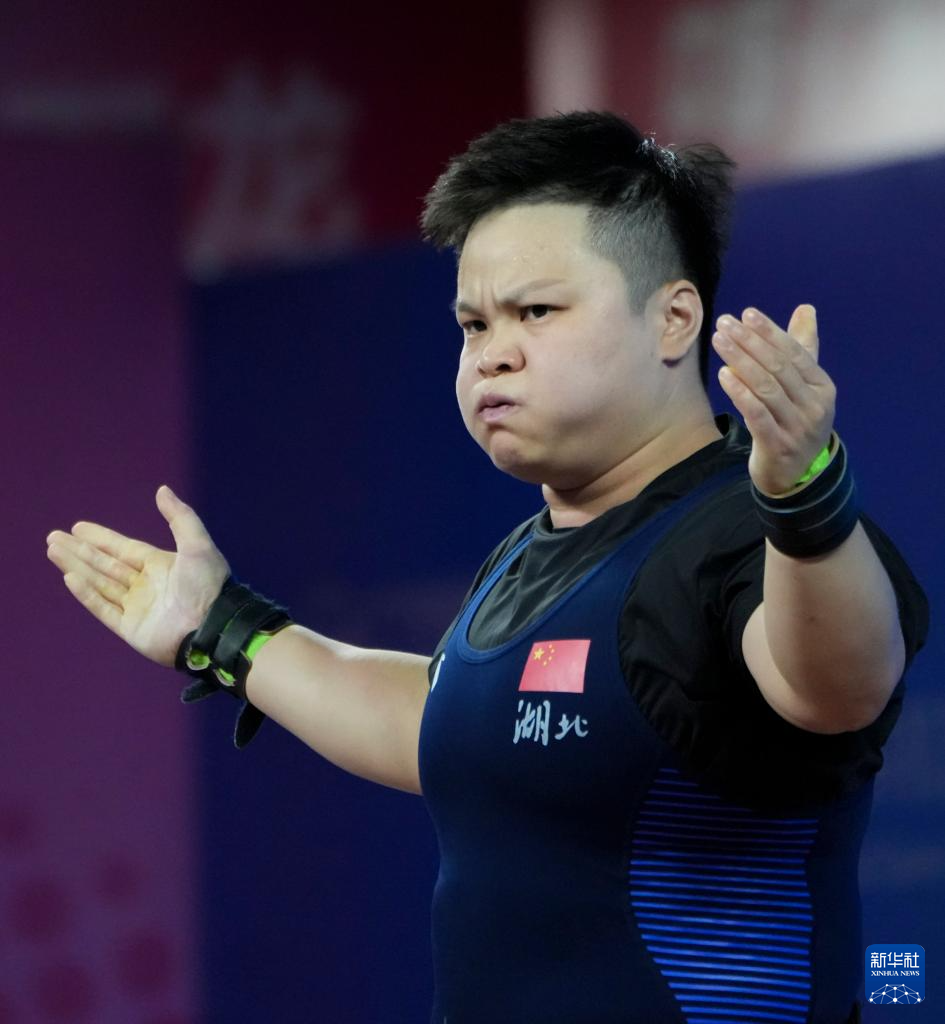 11月14日,湖北队选手汪周雨在抓举比赛中试举成功后庆祝。最终,她夺得冠军。